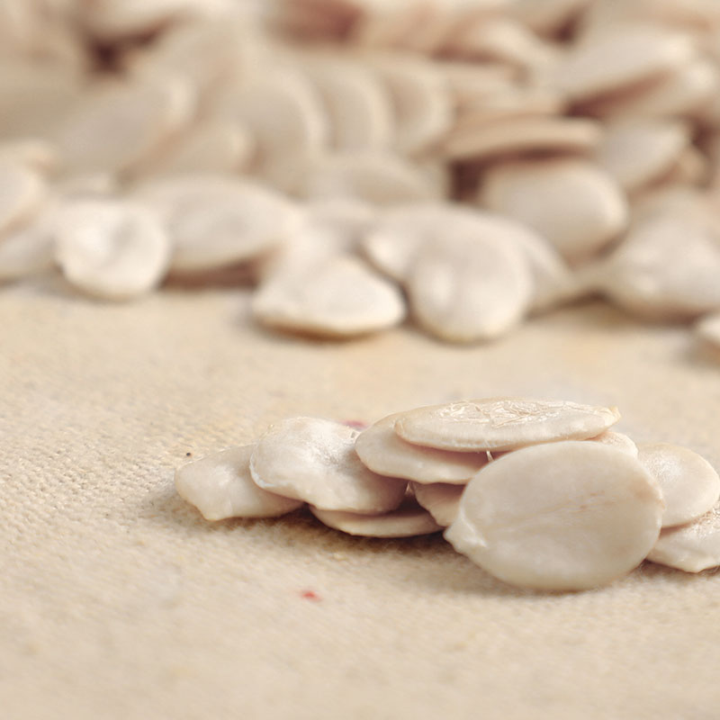 选西瓜籽进行去壳加工,产品成乳白色,籽仁甘甜